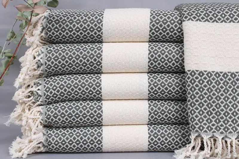 Organic Turkish cotton towels are woven by hand, ensuring exceptional absorbency and soft texture. Characterized by dimensions of 40x71 inches (100x180 centimeters) and a weight of 400 grams, these towels exhibit a ±2 inches (5 cm) tolerance due to hand weaving. Resulting in unique sizes, they also offer personalization options including embroidery of letters, names, or logos with a choice of fonts and colors.