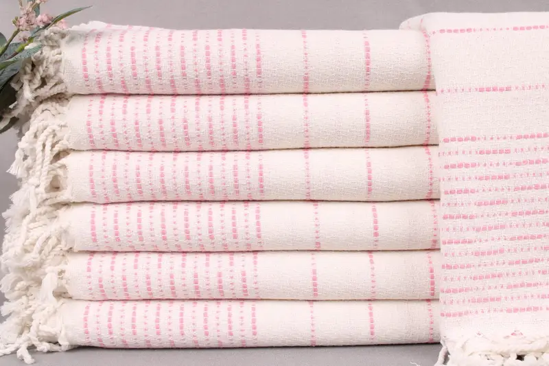 Each Turkish towel is woven from organic Turkish cotton on looms, ensuring high-quality fabric. Resulting in an absorbency that enhances with each use, these towels are designed with dimensions of 38x71 inches or 95x180 centimeters and weigh 420 grams. Due to the hand-weaving process, there is a tolerance of ± 2 inches or 5 centimeters in size.