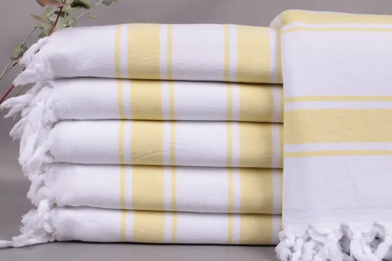 These towels are woven from organic Turkish cotton, ensuring durability and breathability. Characterized by 36x67 inches or 90x170 centimeters dimensions, each towel weighs 450 grams with a ±2" or 5 cm tolerance due to hand weaving. Towels can be personalized with embroidery, accommodating letters, names, or logos in specified fonts and colors at designated placements.