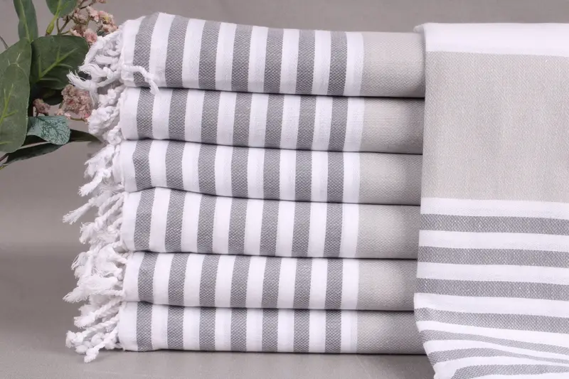 Each beach towel is composed of 100% organic Turkish cotton, ensuring superior absorbency and durability. Characterized by dimensions of 40x71 inches (100x180 cm) and a weight of 280 grams, the towels allow for a ±2" (5cm) tolerance due to hand-weaving. Personalization options include monogramming, letters, or logos in standard or custom fonts, which can be placed at the middle bottom of the towel.