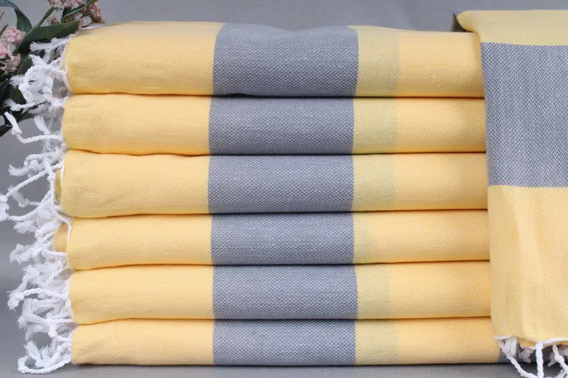Organic Turkish cotton ensures high absorbency and softness for the beach towels, characterized by a 100x180 centimeter dimension, weighing approximately 290 grams. Each towel, being hand-woven on looms, allows for a size tolerance of ± 2 inches or 5 centimeters. Embroidery customization options are available, enabling personalization with letters, names, or logos.