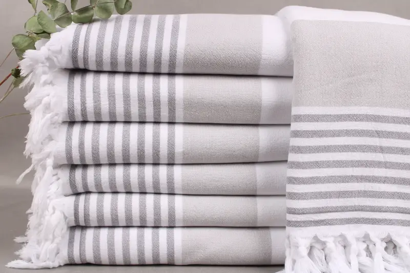 The product is woven from organic Turkish cotton, ensuring a soft and absorbent texture. Resulting in a towel weighing 400 grams and measuring 36x67 inches or 90x170 centimeters, with a tolerance of ±2 inches or 5 centimeters. Characterized by its hand-woven nature, the product allows for personalization with embroidery or names, offering customization options.