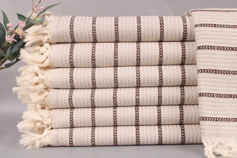 Turkish towels are woven from organic Turkish cotton, ensuring high quality and soft texture. Each towel is characterized by its dimensions, measuring 40x71 inches or 100x180 centimeters with a weight of 440 grams. The hand-weaving process results in a tolerance of ± 2 inches or 5 centimeters in size.