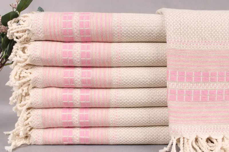 The Bachelorette Towel is woven from organic Turkish cotton, ensuring superior absorbency and softness. Characterized by its meticulous hand-weaving, it measures 38x65 inches (95x165 centimeters) and weighs 420 grams. There is a tolerance of ±2 inches (±5 centimeters) due to the hand-weaving process.