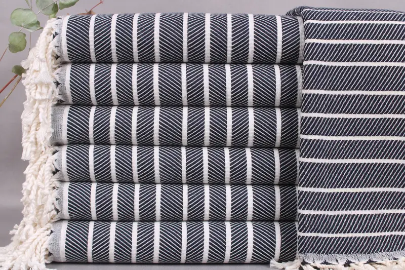 The Turkish towels are woven from organic Turkish cotton, ensuring exceptional softness and absorbency. Characterized by a size of 40x71 inches (100x180 centimeters) and a weight of 360 grams, the tolerance in size is ± 2 inches or 5 centimeters due to the hand-weaving process.