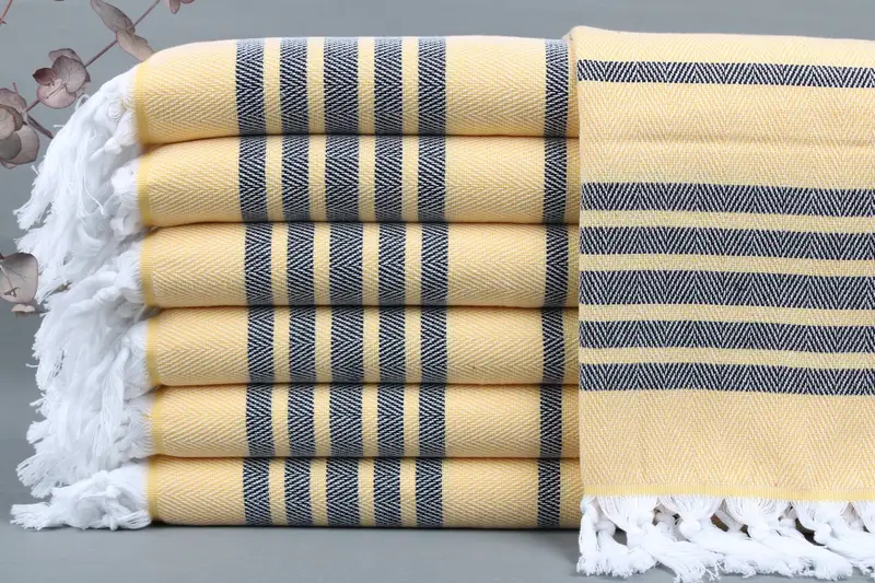 These towels are woven from Organic Turkish Cotton on looms, resulting in high-quality, absorbent materials. Each towel features dimensions of 20x40 inches or 50x100 centimeters, with a tolerance of ± 2 inches or 5 cm due to the hand-weaving process. Weighing 110 grams, the product ensures a balance between lightness and durability.