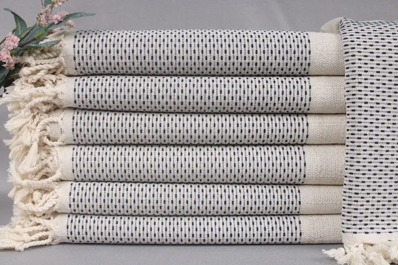 Woven from organic Turkish cotton, the beach towels ensure high absorbency and durability, characterized by their handmade craftsmanship on looms. Measuring 40x71 inches or 100x180 centimeters with a weight of 480 grams, they have a weaving tolerance of ±2 inches or 5 centimeters. Customization options include embroidery or personalized text, with recommendations for placement.