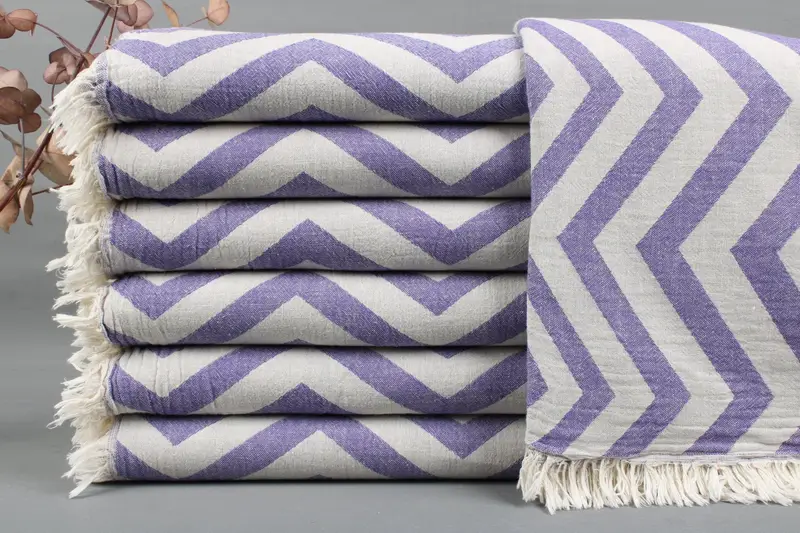Turkish towels are woven from organic Turkish cotton, ensuring high absorbency and durability. Resulting in dimensions of 40x70 inches or 100x180 centimeters, with a weight ranging from 425 to 475 grams. Weaving tolerances of ±2 inches or 5 centimeters are expected.