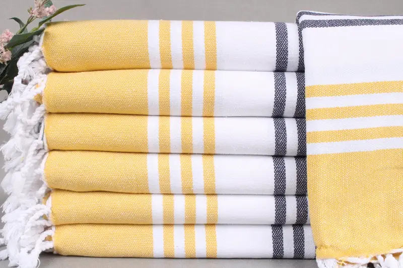 Characterized by organic Turkish cotton, these towels are woven on looms, resulting in high-quality, handmade products. They are ideal for multiple uses, including beach, bath, and spa applications. The towels measure 36x71 inches or 90x180 centimeters with a weight of 340 grams and can have slight variations of ± 2 inches or 5 centimeters due to the weaving process.