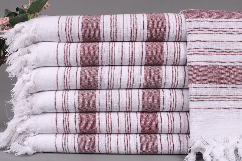 Handwoven Turkish towels and blankets are characterized by their organic Turkish cotton composition, ensuring high absorbency and durability. Each product measures 32x67 inches or 80x170 centimeters, weighing 220 grams, with a tolerance of ±2 inches or 5 centimeters due to the hand-weaving process. Personalization options include embroidery or name insertion, with detailed customization notes provided.