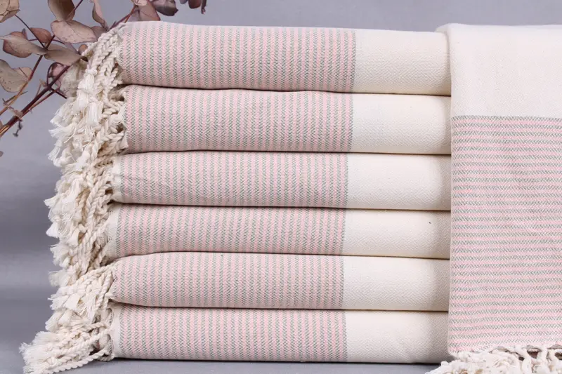 These towels are crafted from organic Turkish cotton, ensuring superior absorbency and comfort. Measuring 40x71 inches or 100x180 centimeters, each towel weighs approximately 300 grams, allowing for a soft yet durable feel. The hand-weaving process introduces a tolerance of ± 2 inches or 5 centimeters in size.