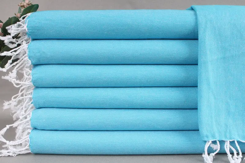 The product is characterized by its fiber composition, specifically Organic Turkish Cotton. Each towel is woven by hand on looms, ensuring high quality and craftsmanship. The towels are pre-shrunk and measure 24x36 inches or 60x90 centimeters, with a weight of 100 grams. The tolerance for size variations is ±2 inches or 5 centimeters due to the hand-weaving process.