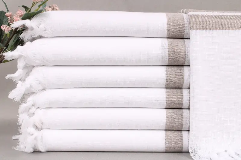 Turkish towels are woven from organic Turkish cotton, ensuring high absorbency and durability. Characterized by a size of 40x71 inches or 100x180 centimeters, these towels weigh 220 grams, with a weaving tolerance of ± 2 inches or 5 centimeters.