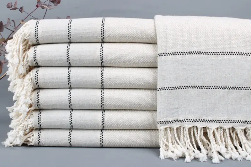 Weaved from organic Turkish cotton, the towels ensure superior absorbency and durability. Each piece exhibits dimensions of 40x71 inches or 100x180 centimeters, with a weight ranging from 425 to 475 grams. Hand weaving results in a tolerance of ± 2 inches or 5 centimeters.