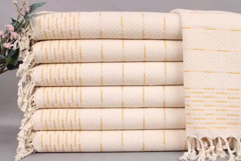 Organic Turkish cotton characterizes the towels, ensuring high absorbency and softness. Resulting in a towel weight of 140 grams, the hand-woven towels measure 18x36 inches or 45x90 centimeters with a tolerance of ±2 inches or 5 centimeters.