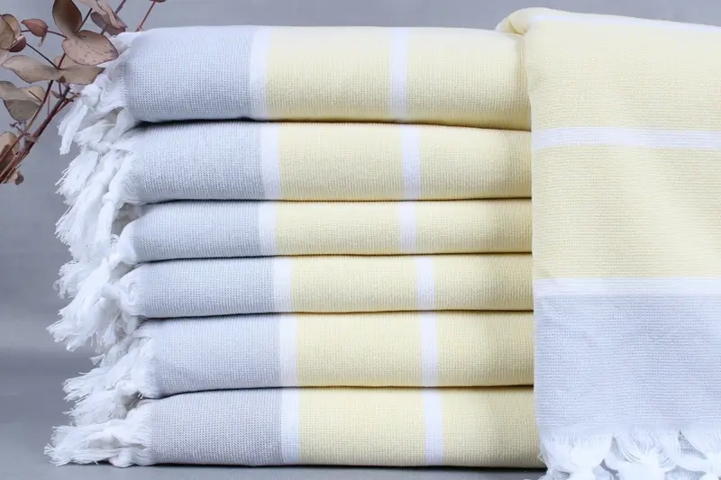 Each beach towel is woven from organic Turkish cotton, ensuring superior absorbency and durability. These towels are characterized by their soft texture and hand-woven construction, resulting in a high-quality product. Each towel measures 40x63 inches or 100x160 centimeters with a tolerance of ±2 inches or 5 centimeters due to the weaving process. The weight of each towel is 500 grams.
