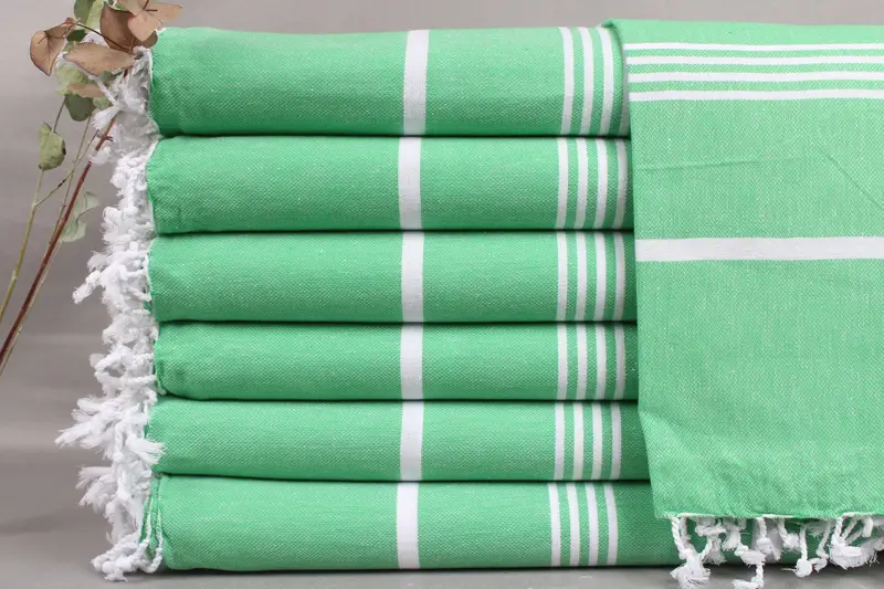 Organic Turkish towels, woven from Turkish cotton, ensure exceptional absorbency. Characterized by dimensions of 40x71 inches or 100x180 centimeters and weighing 266 grams, these towels are handmade with a hand-weaving tolerance of ±2 inches or 5 centimeters. Offering the option for embroidery customization, each towel can be personalized with letters, names, or logos as specified by the customer.