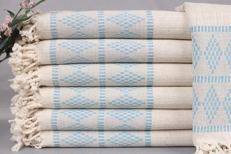 Fiber composition ensures the towels, including beach towels and tea towels, are woven from organic Turkish cotton, resulting in a soft and durable textile. Characterized by a sub-category for wedding gifts, each piece measures 36x71 inches or 90x180 centimeters and weighs 480 grams. Weaving tolerances are ± 2 inches or 5 centimeters.