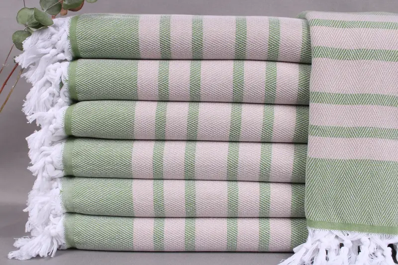 The Turkish towels are woven from organic Turkish cotton, ensuring maximum absorbency and durability. Characterized by dimensions of 36x67 inches or 90x170 centimeters, these towels have a weight of 380 grams, with a hand-weaving tolerance of ±2 inches or 5 centimeters. Towels can be personalized through embroidery or name options, enabling customization of letters, names, or logos in a chosen font and color, with placement typically recommended at the middle of the bottom.