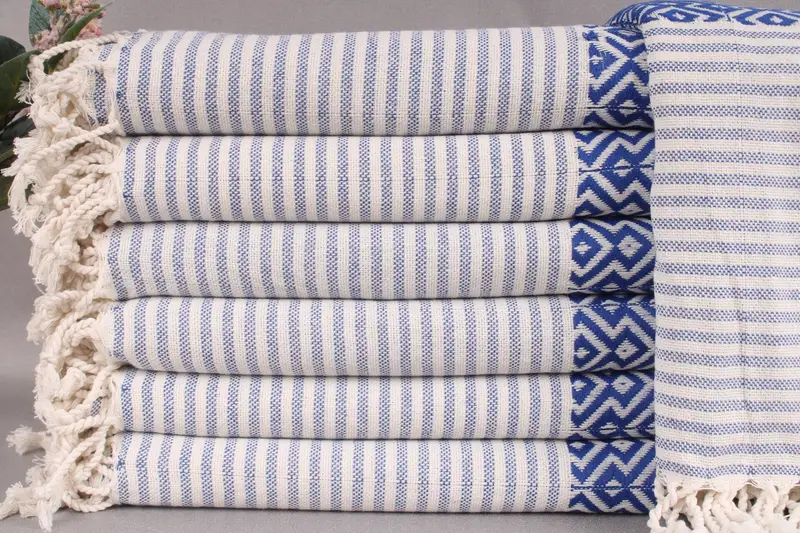 The towels are composed of organic Turkish cotton, ensuring superior absorbency and comfort. Characterized by precise dimensions of 40x77 inches or 100x195 centimeters, they weigh 400 grams each. The hand-weaving process allows for a tolerance of ±2 inches or 5 centimeters.