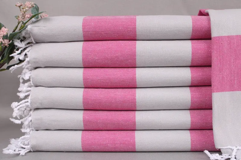 Each towel is woven from organic Turkish cotton on looms, ensuring high absorbency and quality. Measuring 40x71 inches (100x180 cm) with a tolerance of ±2 inches (5 cm), these towels weigh 290 grams. The hand-weaving process results in a soft texture, with a GSM weight ensuring durability.