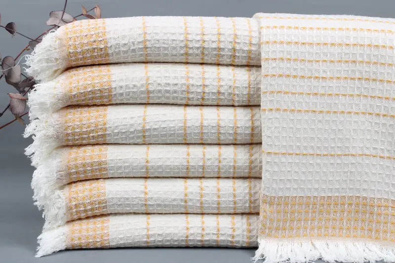 Organic Turkish cotton ensures superior absorbency and durability for the towels. Measuring 20x40 inches or 50x100 centimeters and weighing 140 grams, each piece is woven by hand with an allowable tolerance of ± 2 inches or 5 centimeters. The towels offer personalization options including embroidery or name insertion with specific details to be noted.