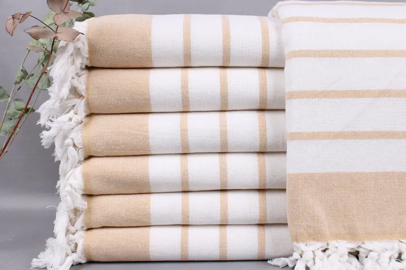Organic Turkish cotton characterizes the beach towels, ensuring superior absorbency and soft texture. Each piece measures 39x67 inches (98x170 cm) and weighs 422 grams, with a hand-weaving tolerance of ±2 inches (5 cm).