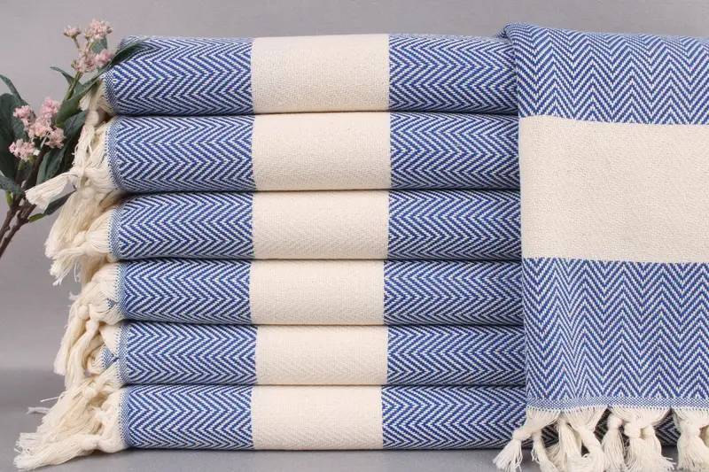 Organic Turkish cotton ensures high quality and absorbency, characterized by its soft texture and durability. Each towel is woven by hand on traditional looms, resulting in a ±2" (±5cm) tolerance in dimensions, providing a standard size of 18x36 inches (45x90 cm) and a weight of 100 grams.