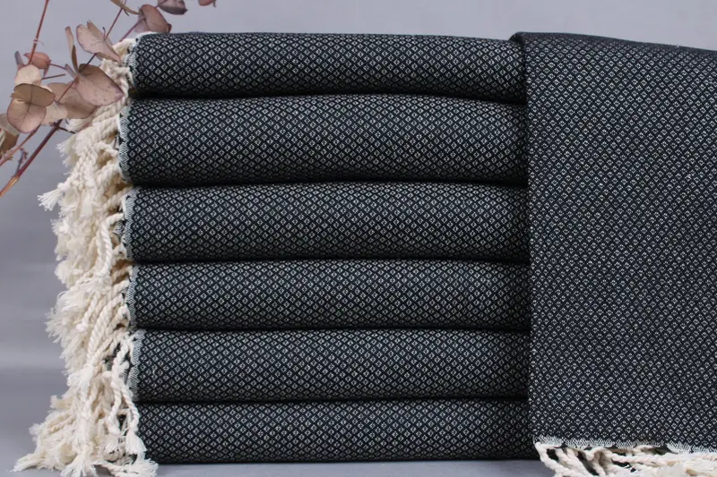 The bath towel is meticulously woven from organic Turkish cotton on traditional looms, ensuring high quality and sustainability. Resulting in a lightweight yet highly absorbent textile, each towel weighs approximately 380 grams and measures 38x63 inches (95x160 cm) with a ±2-inch (5cm) tolerance due to hand-weaving processes.