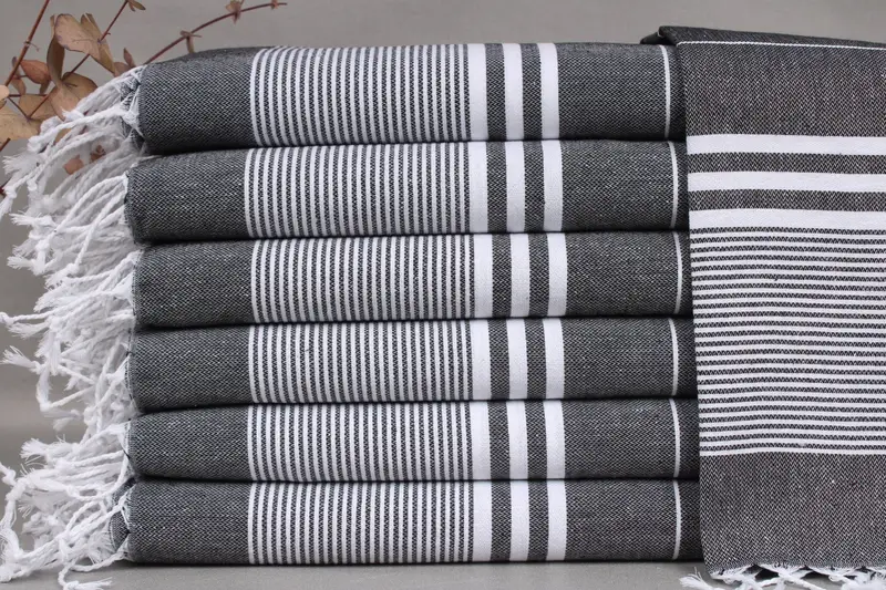 The fiber composition of the Turkish towels is organic Turkish cotton, ensuring high quality and durability. Characterized by their size of 24x40 inches or 60x100 centimeters, these towels weigh approximately 120 grams per square meter, providing optimal absorbency. Hand weaving tolerances of ±2 inches or 5 centimeters are expected.
