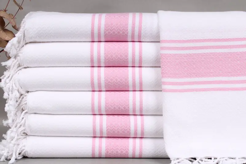 Turkish Towels are woven from organic Turkish cotton, ensuring high absorbency and durability. Each piece measures 40x71 inches or 100x180 centimeters, with a tolerance of ± 2 inches or 5 centimeters due to hand-weaving. The weight of each towel is 288 grams.