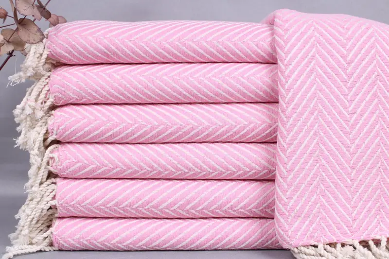 Turkish towels are made from organic Turkish cotton, ensuring superior absorbency and durability. Each towel measures 40x69 inches or 100x175 centimeters, with a weight of 500 grams. The weaving tolerance of ± 2 inches or 5 centimeters contributes to the natural variance of handmade products.