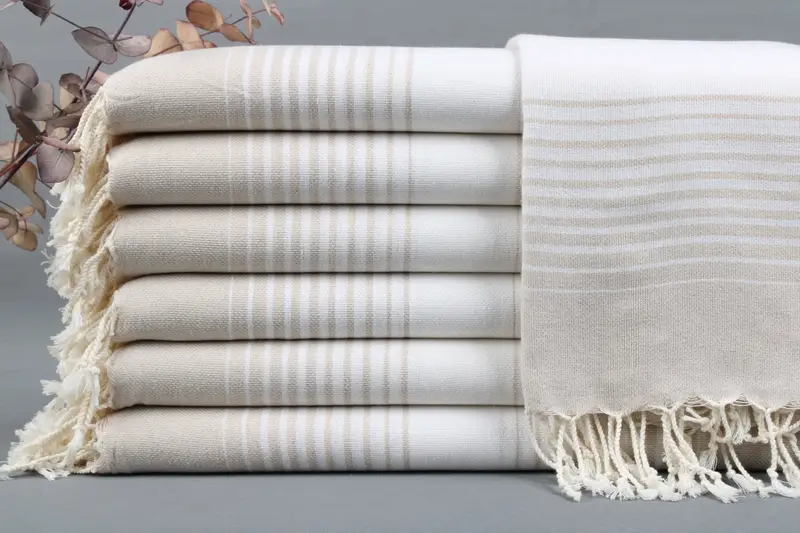 Characterized by their organic fiber composition, the towels are woven from Turkish cotton, ensuring a high degree of absorbency and durability. Resulting in towels that are 40x67 inches or 100x180 centimeters, weighing between 425-475 grams with a hand-weaving tolerance of ±2 inches or 5 centimeters. Personalized with embroidery, each towel is customizable with letters, names, or logos, ensuring a unique and bespoke product.