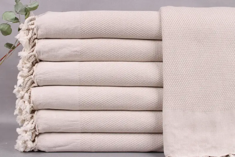 Woven from organic Turkish cotton, the beach towels exhibit high absorbency, ensuring effective moisture management. Each towel measures 40x71 inches (100x180 centimeters) and weighs 390 grams. The size tolerance ranges ± 2 inches or 5 centimeters due to hand-weaving practices.