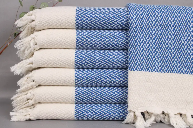 Organic Turkish cotton characterizes the towels, ensuring breathability and superior absorbency. Dimensions are specified at 18x34 inches or 45x85 centimeters, with a weight of 120 grams. The hand-weaving process results in a tolerance of ± 2 inches or 5 centimeters.