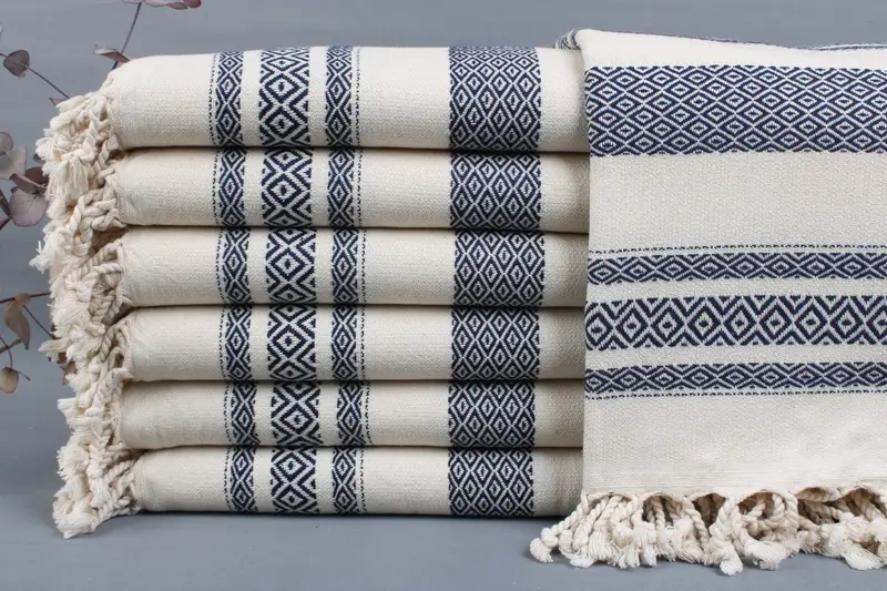 Each towel comprises fibers derived from organic Turkish cotton, ensuring exceptional absorbency and durability. Characterized by a standard dimension of 40x70 inches or 100x180 centimeters, the weight ranges between 425-475 grams. Due to hand-weaving, dimensions may vary by ±2 inches or 5 centimeters.