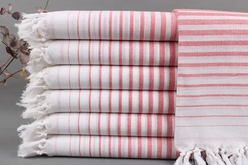 Organic Turkish cotton ensures superior absorbency and softness for the towels. Characterized by a woven hand-made process, the towels feature precise dimensions of 40x69 inches or 100x175 centimeters. These towels typically weigh 240 grams, with a tolerance of ± 2 inches or 5 centimeters due to the weaving process.