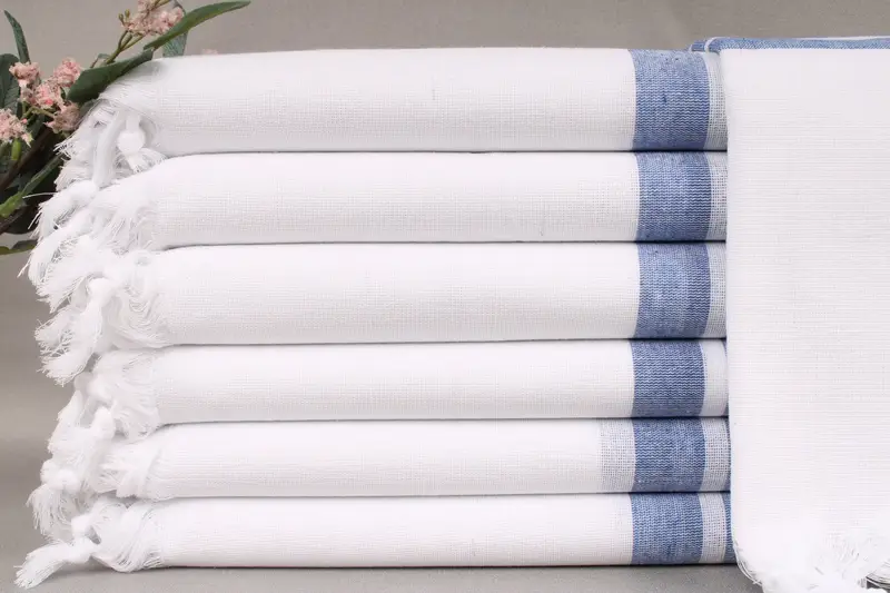Woven from organic Turkish cotton, the beach towels are characterized by high absorbency and durability, resulting in soft and lightweight fabric. Measuring 40x71 inches or 100x180 centimeters, each towel weighs 220 grams with a tolerance of ± 2 inches or 5 centimeters due to hand-weaving. Customization options include embroidery or monogramming with letters, names, or logos, specifying font, color, and placement.