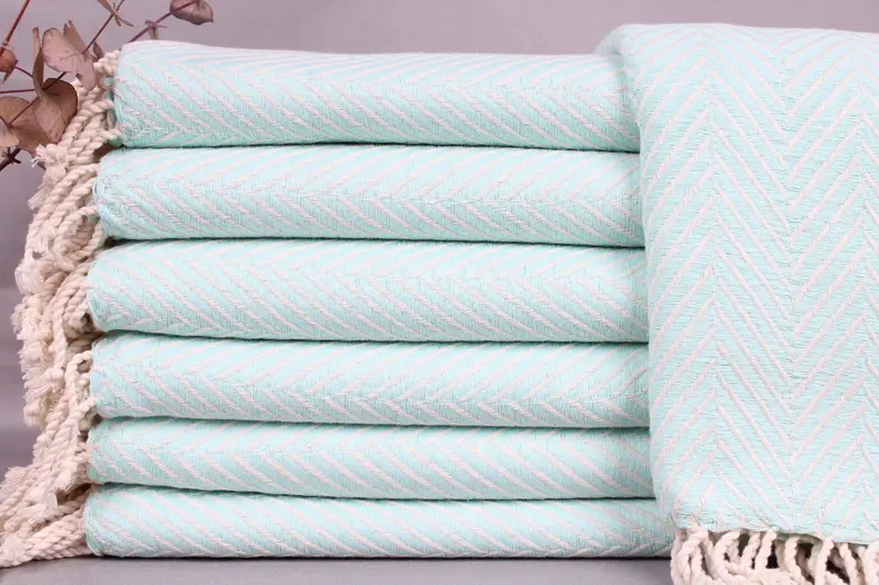 Organic Turkish cotton is used, ensuring superior absorbency and durability. The towels, hand towels, and blankets are woven on looms, resulting in a handcrafted product that measures 40x69 inches or 100x175 centimeters with a tolerance of ± 2 inches or 5 centimeters. Each piece weighs 500 grams and is customizable with embroidery or personalized text, font, and color.