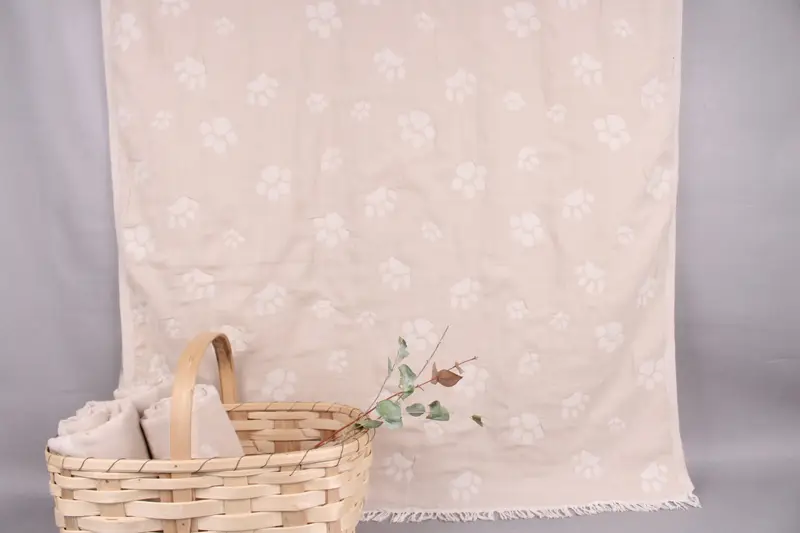 Organic Turkish cotton characterizes the Turkish beach towel, ensuring a natural fiber composition that enhances absorbency. Dimensions measure 36x71 inches or 90x180 centimeters, with a tolerance of ± 2" or 5 centimeters, and weigh 320 grams. These towels are handcrafted, resulting in slight variations typical of artisanal products.