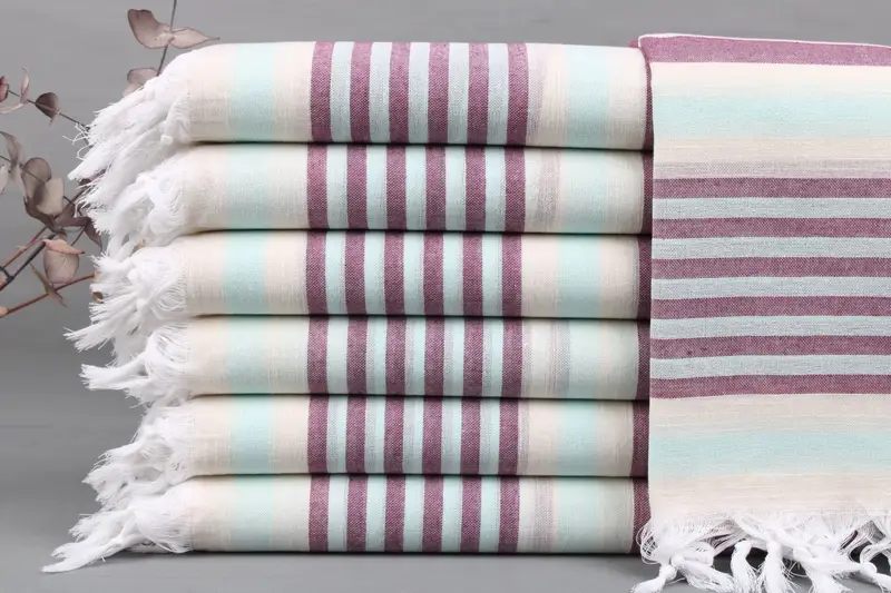 Woven from organic Turkish cotton, these towels are characterized by high absorbency and durability. Measuring 40x67 inches (100x170 cm) with a tolerance of ±2 inches or 5 cm, they weigh 175 grams. Hand-woven in Turkey, they offer meticulous craftsmanship ensuring consistent quality.