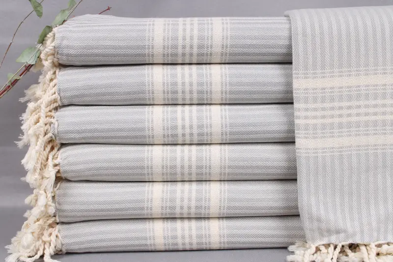 The beach towel is woven from Organic Turkish cotton, ensuring superior quality and absorbency. Characterized by dimensions of 38x67 inches (95x170 cm) and weighing 290 grams, the tolerance for hand-weaving is ± 2 inches or 5 cm. Embroidery customization is available with options for letters, names, or logos in specified fonts and colors, ideally placed at the middle of the bottom.