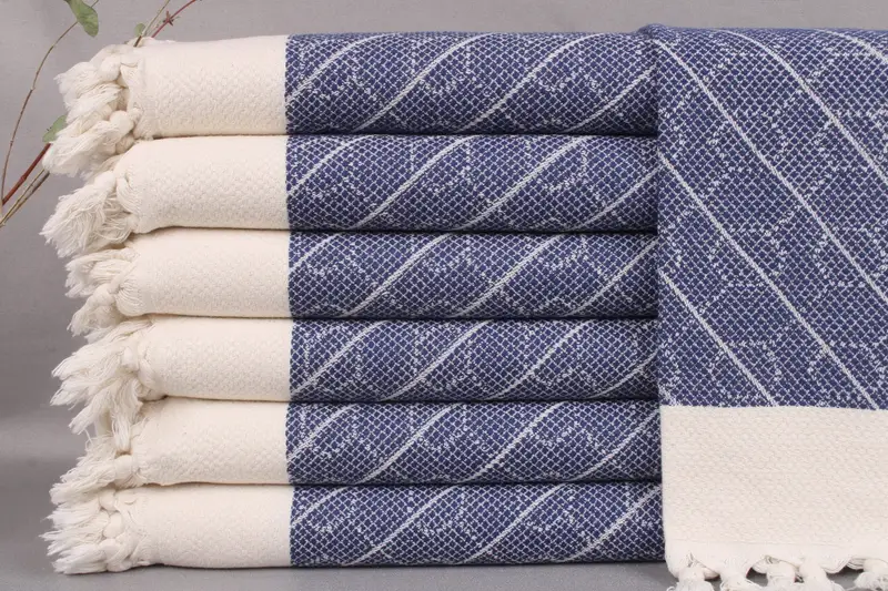 The provided face towels, wedding dish towels, and blankets are crafted from organic Turkish cotton, ensuring durability and softness. Each piece, measuring 18x36 inches or 45x90 centimeters, weighs 120 grams, allowing for versatile usage. Handwoven on looms, they have a tolerance of ± 2 inches or 5 centimeters due to the weaving process.