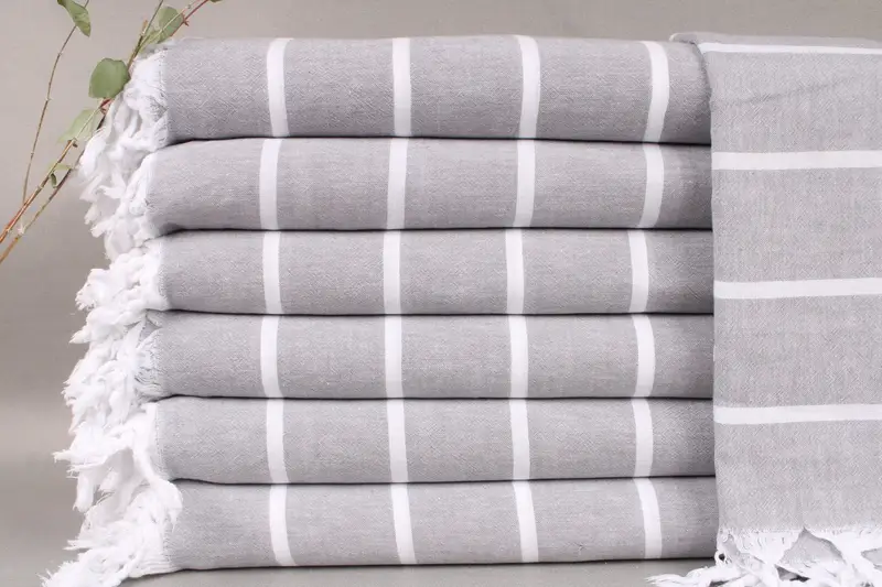 Our Turkish Beach Towels are composed of organic Turkish cotton, ensuring exceptional absorbency and durability. Characterized by a dimension of 36x71 inches or 90x180 centimeters, each towel weighs 180 grams and can exhibit a tolerance of ±2 inches or 5 centimeters due to hand-weaving.