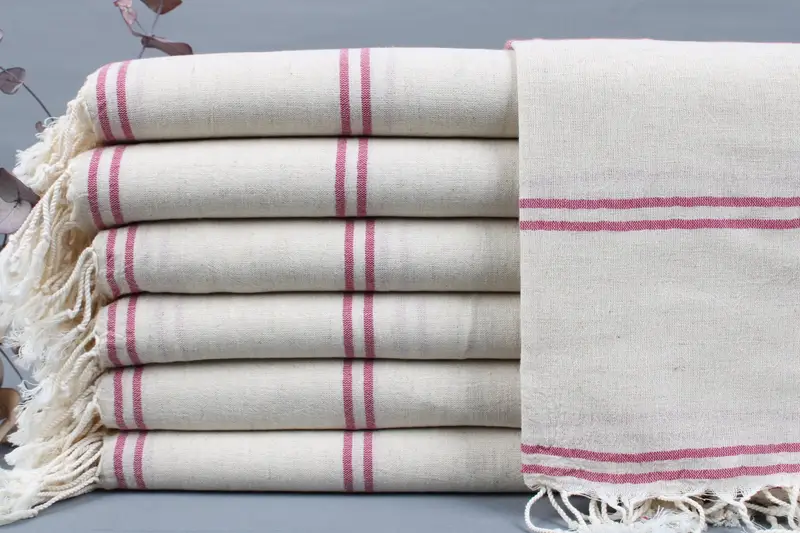 The product is made from organic Turkish cotton, ensuring exceptional softness and durability. Characterized by hand-weaving on looms, each piece exhibits a weight ranging from 425 to 475 grams and dimensions of 40x70 inches or 100x180 centimeters, with a tolerance of ± 2 inches or 5 centimeters. Personalization options include embroidery with names, logos, or letters, with precise placement and color choices available.