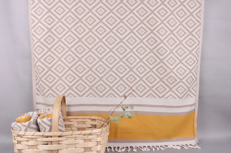 Turkish towels are woven from organic Turkish cotton, ensuring a high-quality fiber composition that is both absorbent and durable. Resulting in a lightweight towel of 420 grams, these towels are crafted by hand on looms with a size of 69x36 inches or 175x90 centimeters, exhibiting a weaving tolerance of ± 2 inches or 5 centimeters.