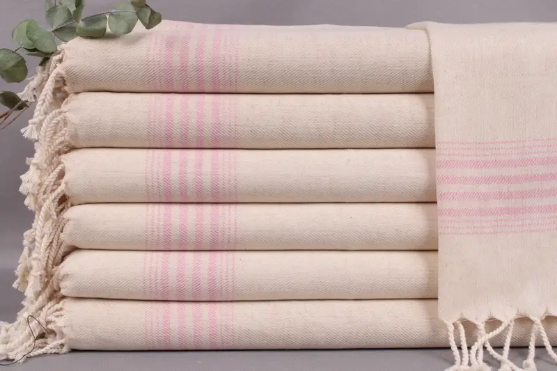 Turkish Towels are woven from organic Turkish cotton on looms, ensuring they are handmade and highly absorbent. Each piece is characterized by precise dimensions of 18x36 inches or 45x90 centimeters, weighing approximately 104 grams. Tolerances of ±2 inches or 5 centimeters may occur due to hand-weaving techniques.