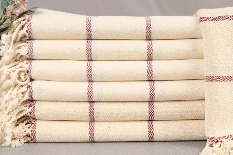 The towels, hand towels, and blankets are characterized by their organic Turkish cotton composition, ensuring maximum absorbency and durability. Each item is woven from high-quality Turkish cotton on traditional looms, resulting in a product that is lightweight yet strong. These items typically weigh 340 grams and measure 38x67 inches (95x170 cm), with a hand-weaving tolerance of ±2 inches (5 cm).