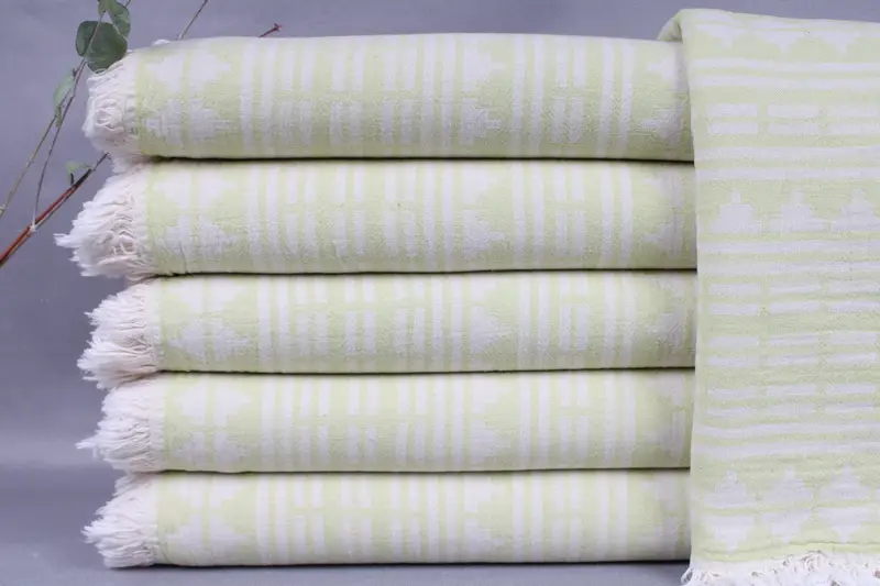 These beach towels are woven from organic Turkish cotton, ensuring a soft and durable product. The towels are characterized by their 40x71 inches dimensions and a weight of 320 grams, resulting in high absorbency. Hand-weaving tolerances are ±2 inches or 5 centimeters, ensuring consistency in product quality.