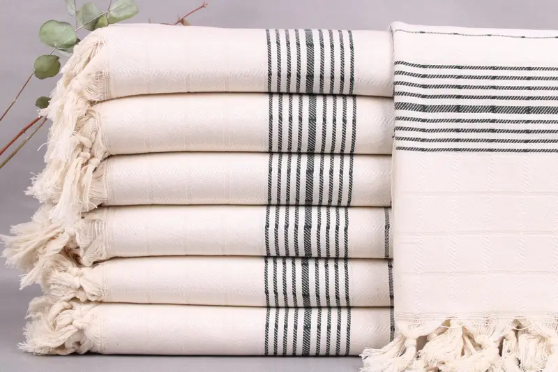 The towels are woven from organic Turkish cotton, ensuring superior absorbency and durability. They measure 40x71 inches or 100x180 centimeters, weighing 370 grams. Weaving tolerances may result in size variations of ±2 inches or 5 centimeters.